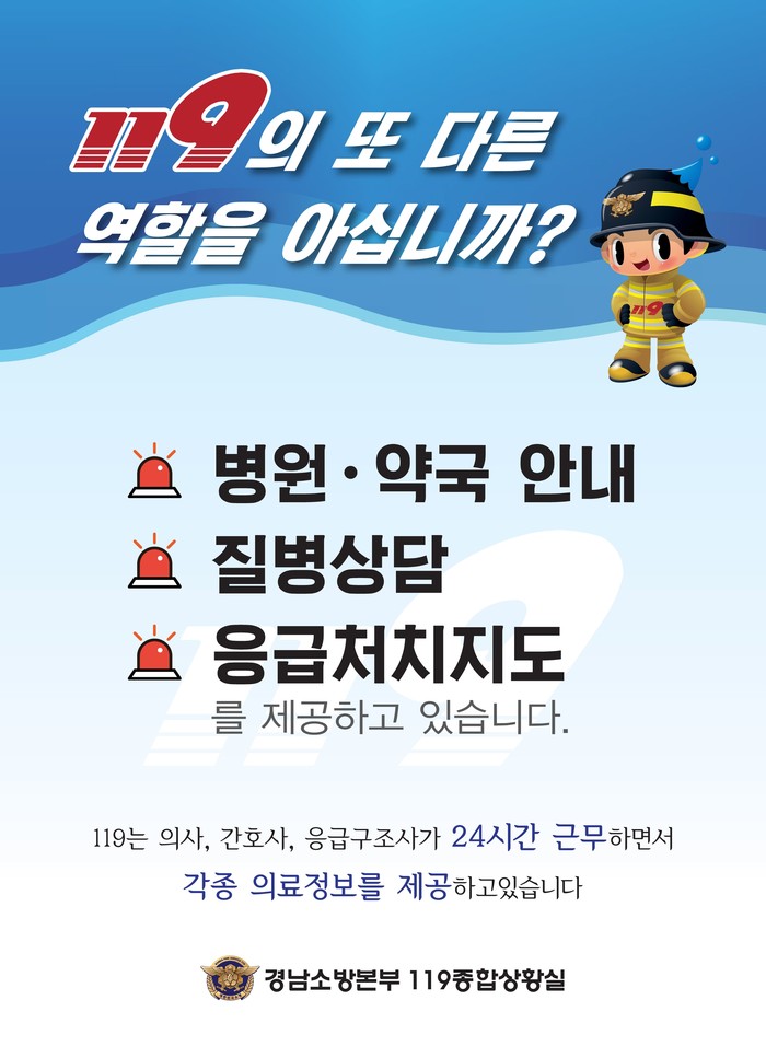 양산소방서(서장 김동권)는 추석 연휴기간 병·의원 휴진 등으로 시민의 불편이 예상됨에 따라 119구급상황관리센터 업무를 적극 홍보한다고 밝혔다.