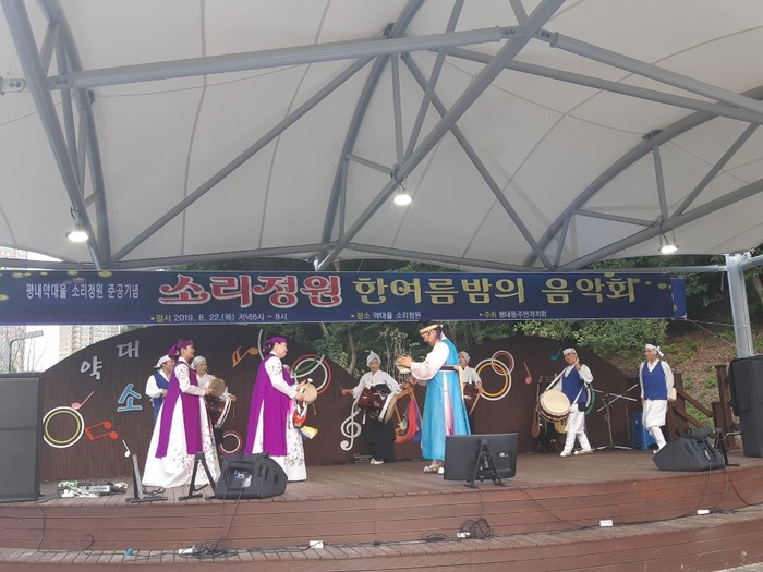 경기 남양주시 평내동주민자치회가 22일 평내동 약대울 소리정원 준공을 기념해 '소리정원 한여름 밤의 음악회'를 개최했다. 이날 행사는 시의원 등의 주요 인사와 지역주민 300여명이 참석한 가운데 진행됐다. 사진은 풍물공연 모습. (사진제공=남양주시청)