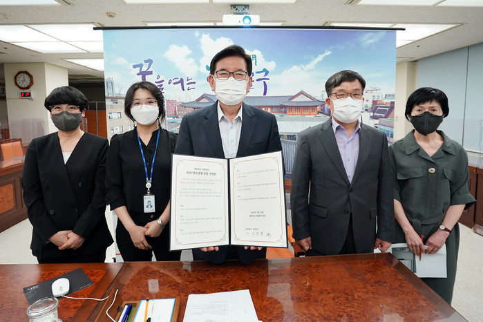 서울 동대문구는 기후변화 대응을 위해 환경부와 ‘탄소중립 지방정부 실천연대’가 공동주관해 지난 24일 열린 ‘탄소중립 실천 특별세션’에 참가해 243개 모든 지자체와 2050 탄소중립을 선언했다. 사진은 유덕열 구청장(가운데)이 2050 탄소중립 공동 선언문에 서명한 후 구 맑은환경과 직원들과 기념촬영을 하고 있는 모습. (사진제공=동대문구청)