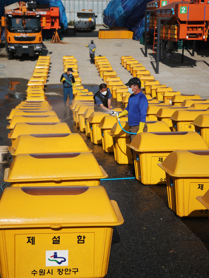 입동(立冬)을 나흘 앞둔 3일 오전 경기 수원시 장안구청 안전건설과 자재창고에서 직원들이 겨울에 사용할 제설함을 세척하고 있다.