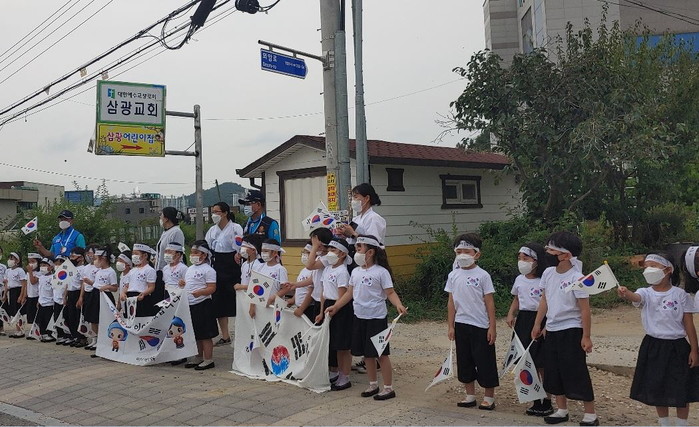 충남 아산시가 최근 제76주년 광복절을 맞아 광복회 아산시지부 주관으로 ‘광복절 기념 호국 캠페인’을 펼쳤다. 좋은나무어린이집에서 열린 이날 행사는 어린이들의 독립선언문 낭독을 시작으로 일제강점기 체험 및 만세운동 재현을 진행했다. 사진은 이날 어린이들이 호국 캠페인을 펼치고 있는 모습. (사진제공=아산시청)