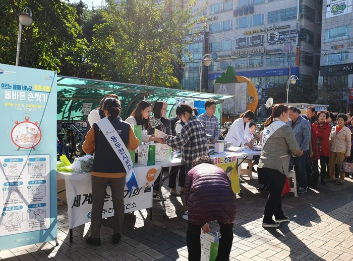 경기 동두천시 보건소가 14일 '세계 손씻기의 날'을 맞이해 지행역 광장에서 손씻기를 홍보하며 감염병 예방 캠페인을 벌였다. 이날 지역내 시민 500여명에게 각종 감염병 예방 홍보물과 리플릿을 배부했다. 사진은 캠페인 진행 모습. (사진제공=동두천시청)