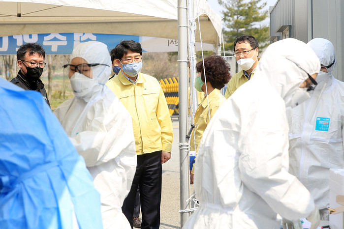 맹정호 충남 서산시장은 지난 1일 종합운동장에 설치된 드라이브 스루 진료소를 방문해 근무자들을 격려하고 검사 진행 상황 등에 대해 점검했다. 사진은 맹 시장이 시 관계자들과 함께 드라이브 스루 진료소에 방문해 진료 현장을 살피고 있는 모습. (사진제공=서산시청)