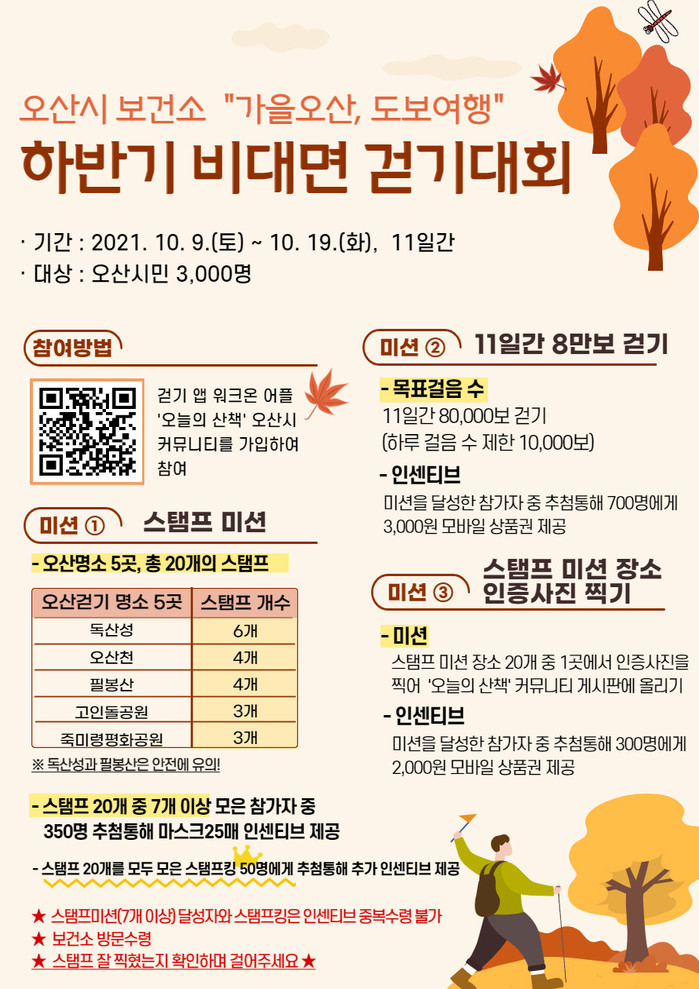 비대면 걷기대회 ‘가을오산 도보여행’에서 각 미션 참가자 중 추첨을 통해 인센티브를 제공할 예정이며, 20개의 스탬프를 모두 모은 스탬프킹 50명을 추첨해 추가 인센티브를 지급할 계획이다.