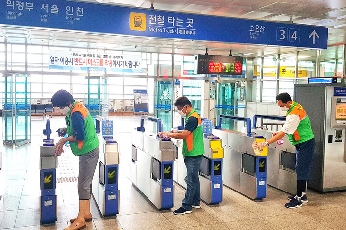 경기 동두천시 지역자율방재단 소속 방범기동순찰연합대가 지난 6일 지역내 전철역 4곳에서 코로나19 방역활동을 전개했다. 이날 대원들은 시민들이 자주 접촉하는 개찰구, 난간 손잡이, 출입문, 에스컬레이터 등을 중점으로 소독했다. 사진은 전철역 개찰구를 소독하는 모습. (사진제공=동두천시청)