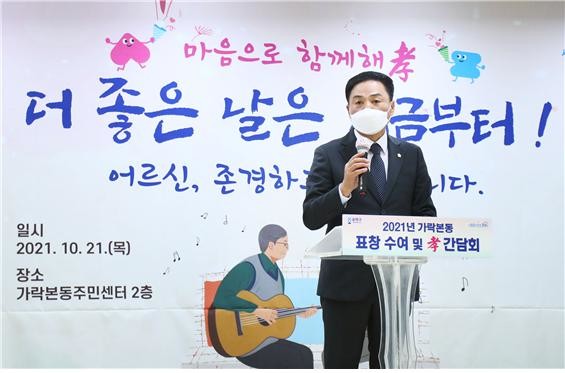 송파구의회 이황수 의장은 최근 가락본동주민센터에서 열린 2021년 가락본동 모범어르신 표창 및 효 간담회에 참석하여 수상하신 어르신들을 축하하고 코로나19로 인해 더욱 소외감을 느낄 수 있는 지역사회 어르신들을 위로하고 격려하는 자리를 가졌다.