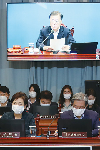 문재인 대통령은 7일 청와대에서 주재한 국무회의에서 코로나19 위기 극복을 위한 노사정의 잠정 합의가 막판에 무산된 것과 관련해 “합의 정신은 적극적으로 살려 나가야 한다”고 밝혔다. 노영민 대통령 비서실장(앞줄 오른쪽)과 김현미 국토교통부 장관(왼쪽)이 7일 오전 청와대에서 열린 국무회의에서 문재인 대통령의 발언을 듣고 있다.