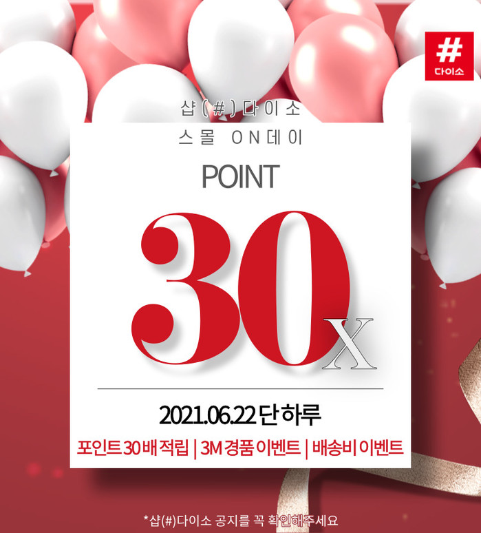 이번 이벤트는 이달 22일 단 하루 동안 샵(#)다이소 앱을 통해 상품을 구매하는 고객 전원에게 조건 없이 다이소 멤버십 포인트 30배 적립 혜택을 제공한다.