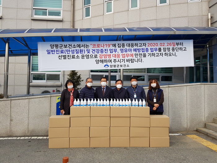 경기 양평군이 최근 (주)에이스제약으로부터 코로나19(우한폐렴) 예방을 위한 손세정제 1000개(1490만원 상당)를 기탁받았다. 이날 전달된 손세정제는 지역내 사회복지시설에 배부될 예정이다. 사진은 관계자들이 기념촬영하는 모습. (사진제공=양평군청)