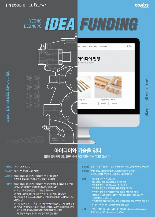 청년 창업자의 참신한 아이디어와 문래동 기술장인의 협업을 지원하는 ‘2021 영등포 아이디어 펀딩’은 문래동의 기계금속 제조장인과 청년 창업자가 협업하여 직접 제작한 시제품을 대중들에게 선보이고, 크라우드펀딩 방식을 도입한 투자 자금 조달방안으로 마케팅 판로 확대를 돕는 영등포구의 신개념 비즈니스 모델이다.