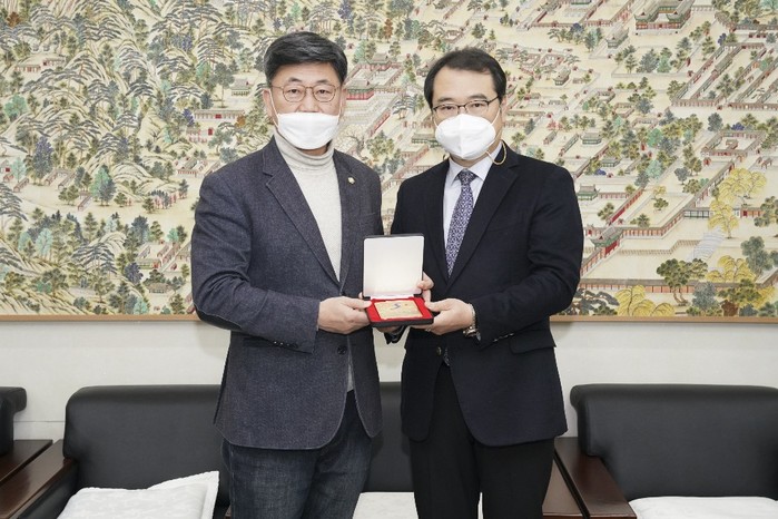 전영준 서울 종로구의원이 최근 종로구의회 의원으로 활동하면서 종로귀금속단지의 생활안전과 협회의 활동을 위해 많은 노력을 기울인 공을 인정받아 종로귀금속생활안전협의회 남강우 회장으로부터 감사패를 받았다. 사진은 감사패를 받고 기념촬영을 하고 있는 전 의원(왼쪽)의 모습. (사진제공=종로구의회)