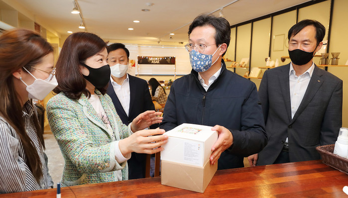 | ▲ 직원들과 함께 영등포사랑상품권으로 물건을 구매하는 채현일 구청장(오른쪽에서 두 번째)의 모습.(사진제공=영등포구청) |