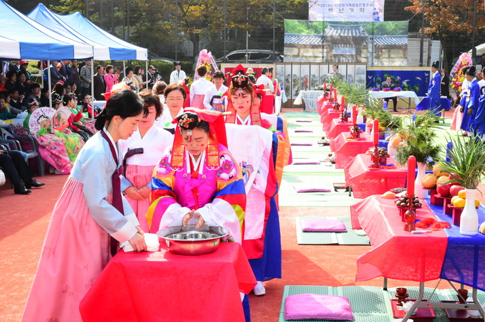 서울 중랑구는 지난 20일 망우동 저류조공원에서 사단법인 휴앤해피와 손잡고 경제적인 부담과 다양한 사연으로 결혼식을 올리지 못한 다문화가족 7쌍(베트남 6쌍, 중국 1쌍)의 합동전통혼례식을 개최했다. 사진은 '전통혼례식'에서 ‘관세우’가 진행 중인 모습. (사진제공=중랑구청)