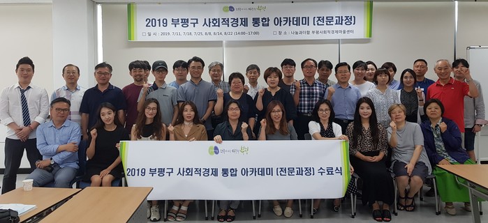 인천 부평구는 22일 부평사회적경제마을센터에서 ‘2019 사회적 경제 통합 아카데미 전문과정 수료식’을 개최했다. 사진은 수료식에 참석한 관계자들이 기념촬영을 하는 모습.(사진제공=부평구청)