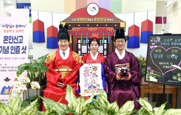 경기 의정부시가 9일 시청 민원실에서 안병용 시장과 지역에서 혼인신고를 한 신혼부부가 함께 전통 혼례복을 입고 기념촬영을 하는 특별한 이벤트 '시장님과 함께하는 혼인신고 기념 촬영'을 진행했다. 사진은 안 시장(왼쪽)과 신혼부부가 기념촬영하는 모습. (사진제공=의정부시청)