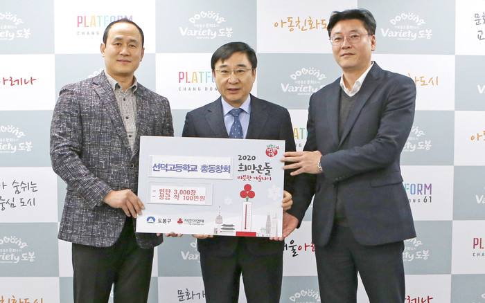 서울 도봉구는 최근 선덕고등학교 총동창회로부터 지역내 어려운 이웃들을 위한 성금 100만원을 전달받았다. 기탁된 성금은 동주민센터 및 복지기관을 통해 전달될 예정이다. 사진은 이동진 구청장(가운데)과 총동창회 회원들이 기념촬영을 하는 모습. (사진제공=도봉구청)