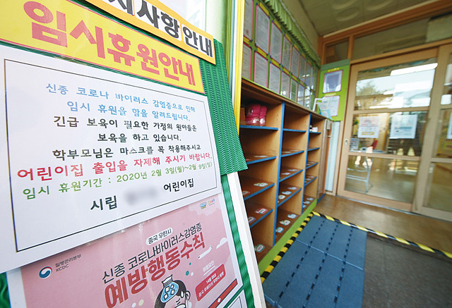 3일 오후 경기 수원시 한 어린이집 입구에 신종 코로나바이러스 감염증(신종코로나) 확산 방지를 위한 휴원 안내문이 붙어 있다. 수원시는 신종 코로나바이러스 감염증 15번째 확진 환자가 수원에서 발생함에 따라 면역력이 약한 영유아들의 안전을 위해 지역내 1061개 모든 어린이집에 3∼9일 휴원 조치했다.