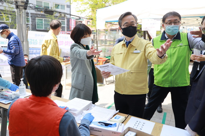 유성훈 서울 금천구청장이 서울시 재난긴급생활비 동주민센터 방문접수가 시작된 16일 독산4동과 시흥4동 주민센터를 찾아 접수 진행상황을 점검했다. 사진은 유 구청장(오른쪽에서 두 번째)이 독산4동 주민센터 재난긴급생활비 접수현장을 점검하고 있는 모습.(사진제공=금천구청)