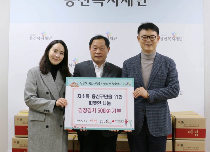 서울 용산복지재단이 최근 (주)디코테, (주)이킴으로부터 지역내 취약계층을 위한 김장김치 500kg(220만원 상당)을 전달받았다. 이날 전달된 김치는 홀몸노인 등 지역내 저소득 가구에 전달될 예정이다. 사진은 관계자들의 기념촬영 모습. (사진제공=용산구청)