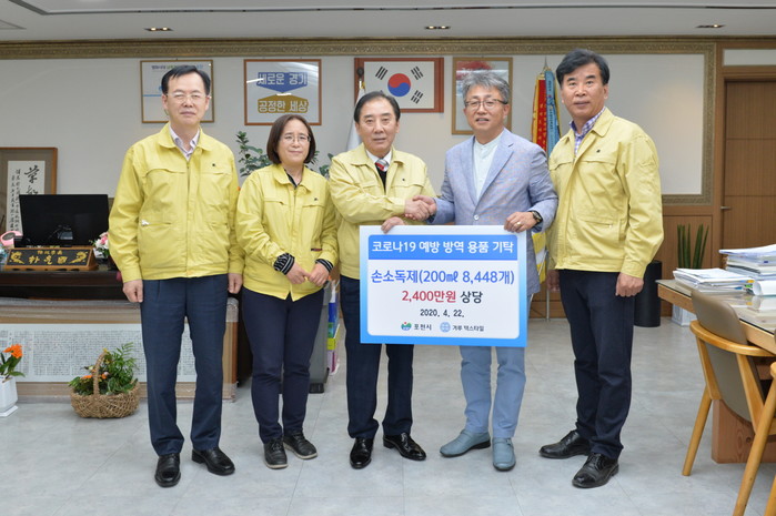 22일 경기 포천시 가산면 소재 마스크용 밴드 제조 생산업체인 겨루 텍스타일은 손 소독제 8400여개(2400만원 상당)를 포천시에 기부했다. 사진은 기탁식에서 박윤국 시장(가운데)과 업체 대표 및 시 관계자들이 기념촬영을 하는 모습. (사진제공=포천시청)