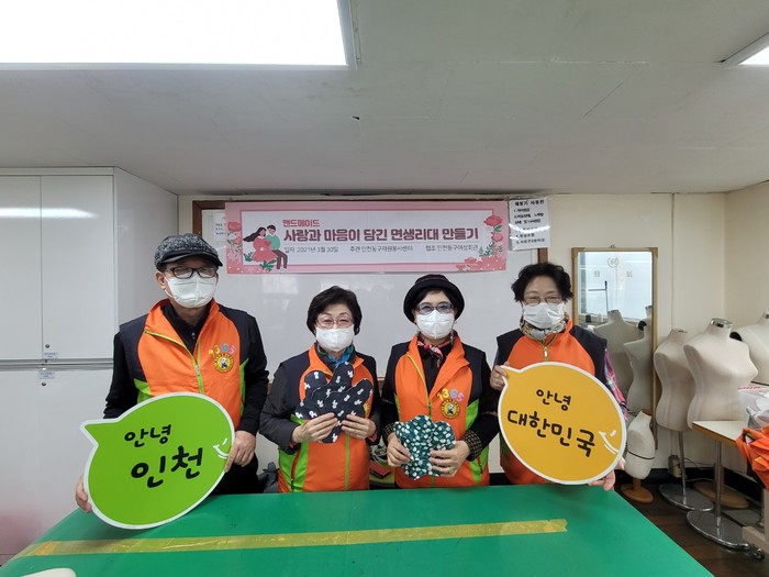 인천 동구 자원봉사센터는 최근 '핸드메이드·사랑과 마음이 담긴 면생리대 만들기' 활동을 진행했다. 봉제 재능을 가진 7명의 자원봉사자가 유기농 원단 재단부터 재봉까지 제작에 직접 참여했다. 사진은 봉사자들 기념촬영을 하고 있는 모습. (사진제공=동구청)
