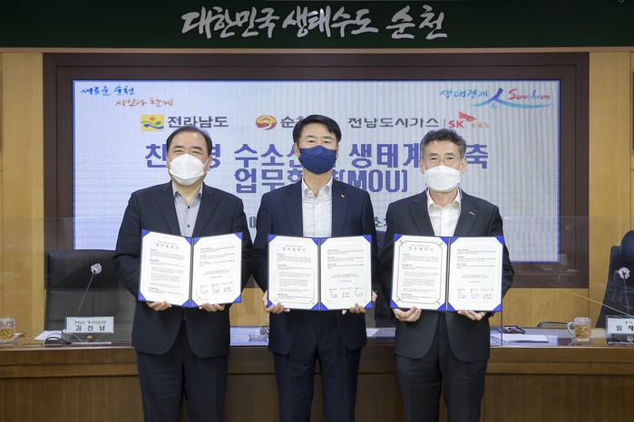 전남 순천시가 시청 소회의실에서 전남도, 전남도시가스(주)와 '친환경 수소산업 생태계 구축' 업무 협약을 체결했다. 이날 협약에 따라 기후위기를 극복할 최적의 에너지인 수소를 활용한 수소충전소 및 수소연료전지발전소 확충을 통한 친환경 수소산업 생태계를 구축하기로 했다. 사진은 이날 협약 체결 후 관계자들이 기념촬영을 하는 모습. (사진제공=순천시청)