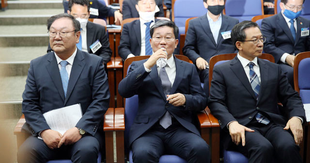 6일 오전 국회에서 열린 더불어민주당 원내대표 후보자 합동토론회에서 김태년(왼쪽부터), 전해철, 정성호 의원이 토론회 시작을 기다리고 있다.