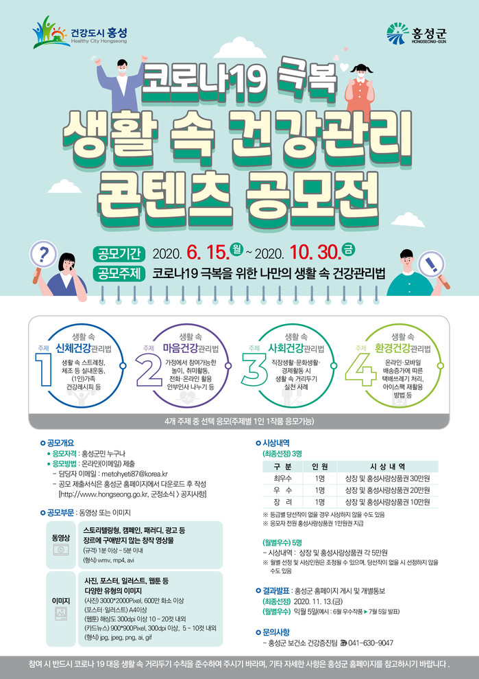 | ▲ '코로나 19 극복 생활 속 건강관리 콘텐츠 공모' 포스터. (사진제공=홍성군청) |