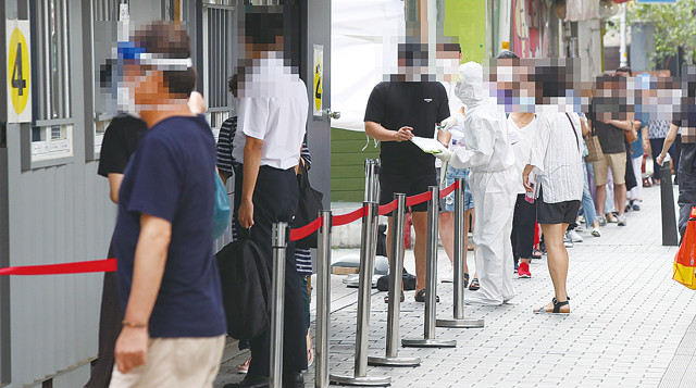 18일 오전 서울 성북구보건소에 마련된 신종 코로나바이러스감염증(코로나19) 임시 선별진료소를 찾은 시민들이 검사 순서를 기다리고 있다.
