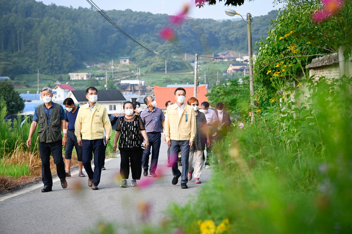 이항진 경기 여주시장이 최근 산북면 후리 마을을 방문해 쌈지공원, 서희장군 묘 등을 둘러보며 로드체킹을 진행했다. 사진은 이날 이 시장(앞줄 오른쪽)과 마을 관계자들이 함께 걸으며 마을을 둘러보고 있는 모습. (사진제공=여주시청)