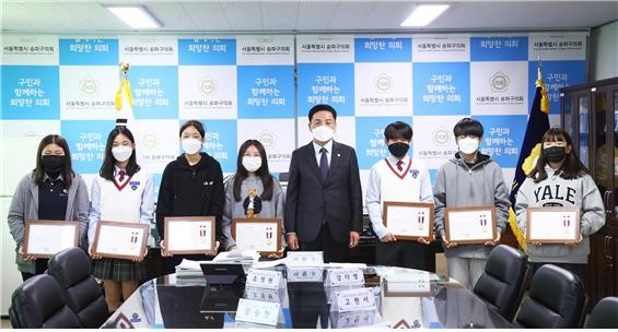 서울 송파구의회 이황수 의장은 최근 송파구의회 의장실에서 청소년 교통규칙 교육와 스쿨존 안전운전 캠페인에 솔선수범하는 등 선진 교통안전 문화 확산에 기여한 공이 큰 청소년 7명(문정중-강다영, 문현중-고현서·백영민, 아주중-김다인·장승헌, 정신여중-김시오, 가원중-조정원)에게 표창장을 수여했다.