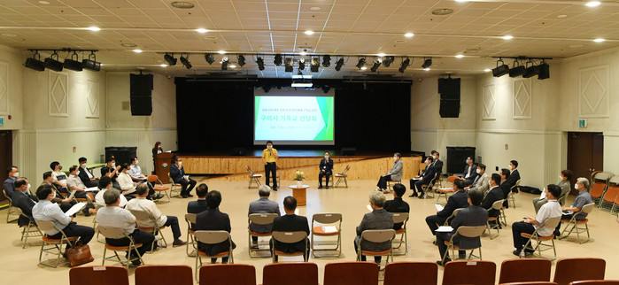 경기 구리시는 8일 구리시기독교연합회 목회자들이 참석한 가운데 코로나19 대응 민·관 협력체계 구축을 위한 간담회를 개최했다. 간담회에서는 전자출입명부 설치 등 방역수칙 의무화 협력에 대해 논의했다. 사진은 간담회가 진행되고 있는 모습. (사진제공=구리시청)