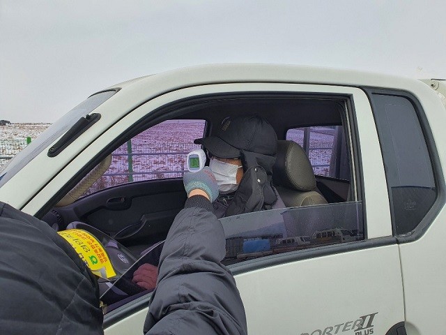 | ▲ 영암군, 가축경매시장 방문자 발열 체크 / 영암군 제공 |