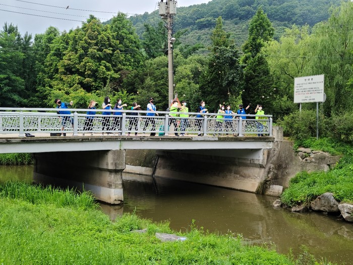 인천 남동구자원봉사센터는 최근 장수천 일대에서 대학생 자원봉사자 30여명이 참석한 가운데 수질정화 봉사활동의 일환으로 EM흙공 던지기 활동을 진행했다. 사진은 대학생들이 EM흙공을 던지고 있는 모습. (사진제공=인천 남동구청)