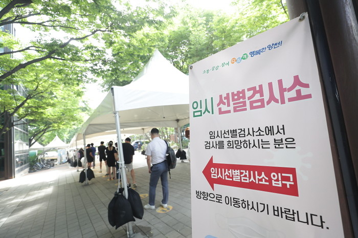 서울 양천구 보건소 임시선별진료소 대기 장소에 폭염을 피할 수 있도록 텐트가 설치됐다. 구는 보건소와 신월문화체육센터 임시선별진료소 2곳에 텐트를 설치해 검사를 위해 긴 줄을 서야 하는 구민들이 더위를 피할 수 있도록 했다. 사진은 14일 검사를 받기 위해 길게 줄을 서 있는 구민들의 모습. (사진제공=양천구청)