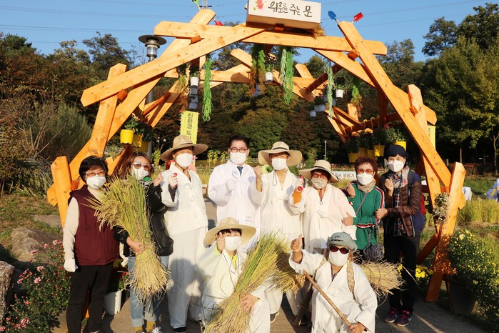 이정훈 서울 강동구청장이 25일 도시농업공원에서 열린 ‘가을걷이 추수행사’에 참석해 ‘강동토종지킴이’와 ‘선사고등학교 학생체험단’과 함께 벼 베기를 시작으로 탈곡 및 도정까지 쌀이 되는 과정을 몸소 체험했다. 사진은 이 구청장(가운데)이 참가자들과 함께 기념촬영을 하고 있는 모습. (사진제공=강동구청)