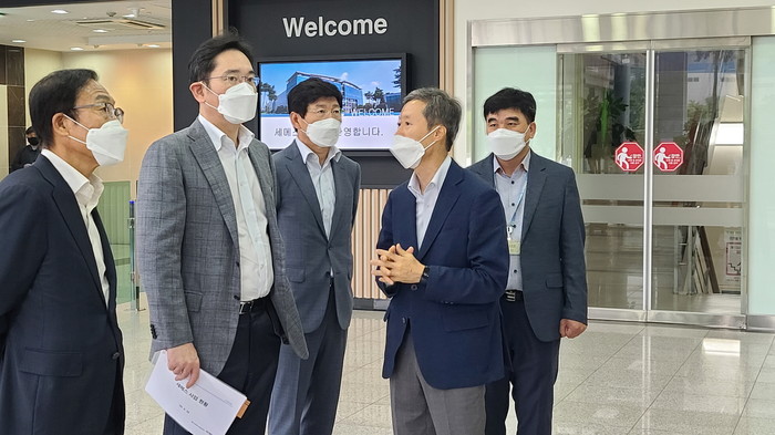 | ▲ 이재용 삼성전자 부회장이 30일 세메스 천안사업장을 찾아 사업장을 살펴보는 모습.(사진제공=삼성전자) |