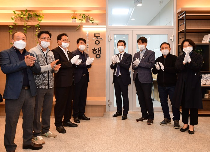 경기 화성시 동탄8동 주민자치회가 마을공동체 활성화사업으로 바리스타 교육장과 함께 어린이 식생활 개선 프로그램 등이 운영될 '공유부엌'을 조성하고 21일 현판식을 개최했다. 사진은 현판식에서 서철모 시장(오른쪽 네 번째)과 관계자들이 기념촬영을 하고 있는 모습. (사진제공=화성시청)