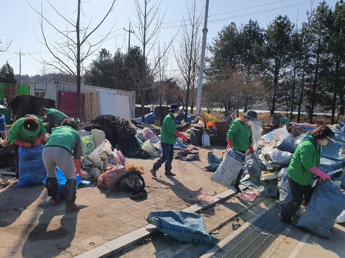 경기 양평군 양동면 새마을회가 봄을 맞이해 최근 각 마을에 산재돼 있는 농촌 폐비닐을 수거했다. 이날 각 마을 새마을지도자와 부녀회 등 40여명은 농지와 농가 주변에 버려진 폐비닐 30여톤을 수거했다. 사진은 새마을회원들이 폐비닐을 수거하는 모습. (사진제공=양평군청)