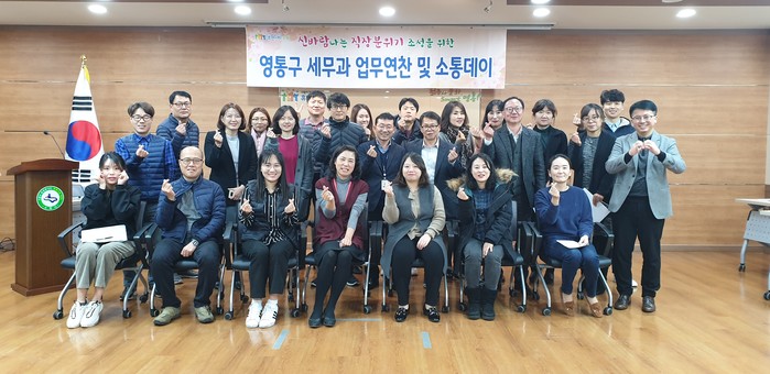 경기 수원시 영통구 세무과는 21일 구청 상황실에서 부서 전직원이 참석한 가운데 지방세 체납 징수를 중심으로 업무연찬회를 개최했다. 사진은 연찬회에 참여한 관계자들이 기념촬영을 하는 모습.(사진제공=영통구청)
