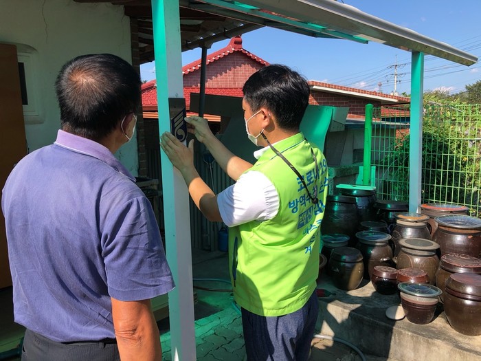 경기 여주시 금사면은 8일 ‘국가유공자 명패 달아드리기’ 사업으로 월남전참전 유공자 윤선용씨 자택을 방문해 국가유공자 명패를 달았다. 사진은 국가유공자 가구에 명패를 달고 있는 모습. (사진제공=여주시청)