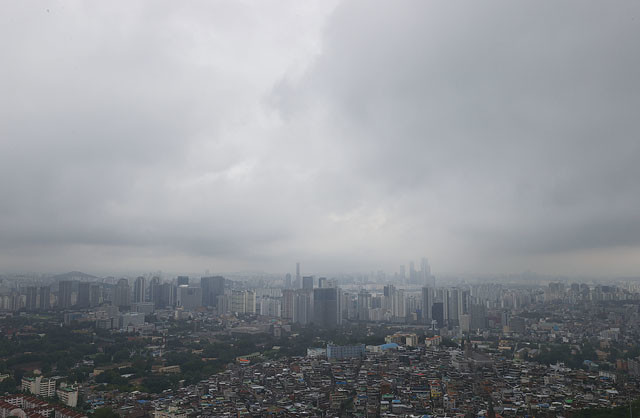 중부지역 장마가 49일째 이어지고 있는 11일 오전 서울 중구 남산에서 바라본 서울시내 위로 비구름이 지나가고 있다.