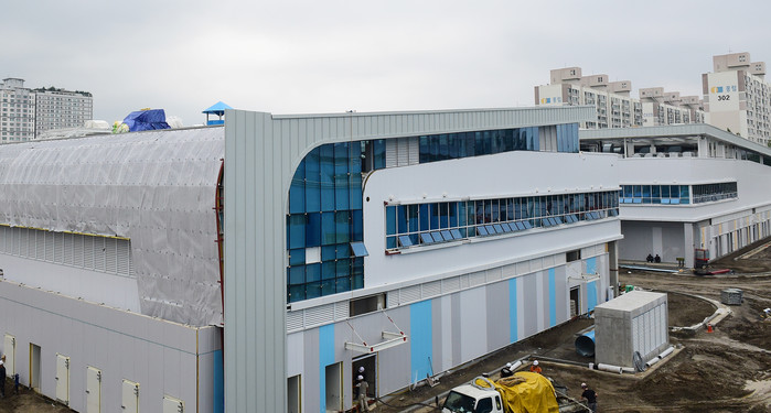 | ▲ 이달 말 입주를 앞둔 신축 수산동(왼쪽)과 과일동이 마무리 공사를 진행 중이다. (사진제공=수원시청) |