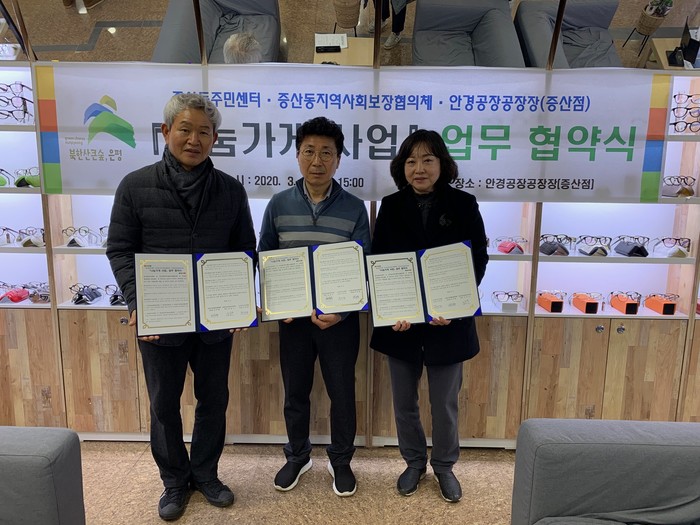서울 은평구 증산동 주민센터, 증산동지역사회보장협의체, ‘안경공장공장장 증산점’이 '나눔가게 사업 업무협약'을 체결했다. 협약에 따라 안경공장공장장은 지역내 저소득계층 저시력자를 위한 안경나눔 실천에 적극 나선다. 사진은 협약 체결 후 기념촬영을 하고 있는 관계자들의 모습. (사진제공=은평구청)