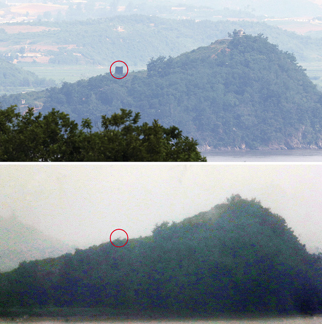 24일 오전 경기 파주시 오두산 전망대에서 바라본 북한 지역에 대남 확성기 시설이 철거돼 있다. 위 사진은 전날 같은 지역에서 보였던 확성기 시설.