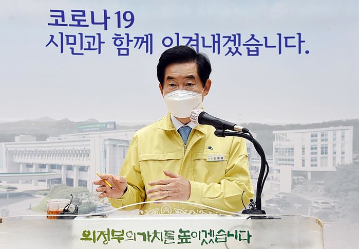 경기 의정부시는 코로나19 집단 발생으로 오는 17일까지 시내 도서관, 예술의전당, 종합사회복지관, 경로당 등 공공시설 운영 중단 조치를 연장한다고 12일 밝혔다. 사진은 브리핑하는 안병용 시장.