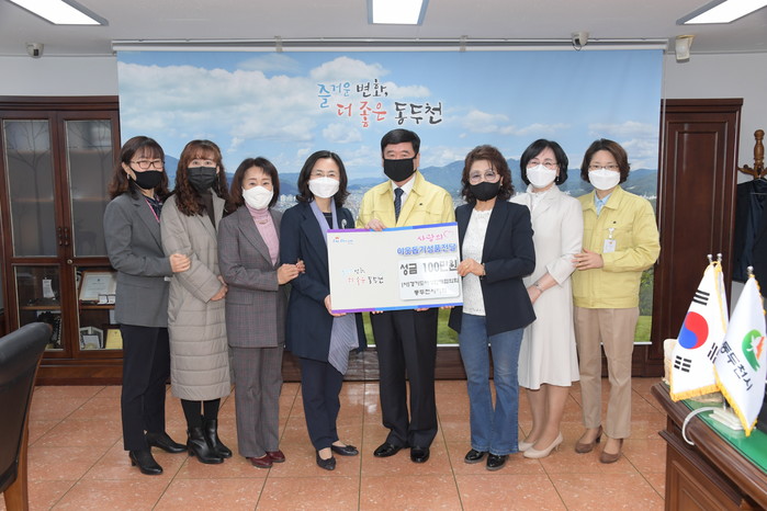 경기 동두천시 여성단체협의회가 최근 시청을 방문해 '코로나19로 힘들어하는 시민들을 위해 써달라'며 성금 100만원을 전달했다. 사진은 성금 전달식 진행 후 최용덕 시장(왼쪽에서 다섯 번째)과 협의회 관계자들이 기념촬영을 하는 모습. (사진제공=동두천시청)