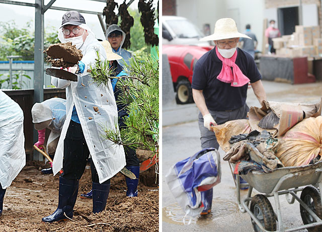 더불어민주당 김태년 원내대표가 11일 오전 충북 음성군 삼성면 대야리에서 수해 복구 봉사활동을 하고 있다. 미래통합당 주호영 원내대표도 이날 전남 구례군 문척면 구성마을에서 마을회관에 남아있는 침수 피해 폐기물을 옮기고 있다.
