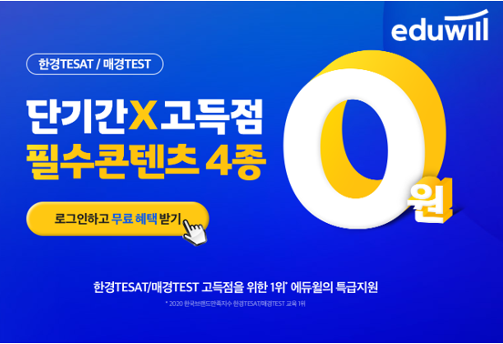 회원가입만 하면 무료로 받아볼 수 있는 한경 테샛, 매경 테스트 단기간 고득점 필수콘텐츠 4종에 대한 자세한 내용은 에듀윌 홈페이지를 통해 확인할 수 있다.