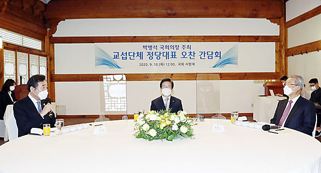 더불어민주당 이낙연 대표가 10일 서울 여의도 국회 사랑재에서 열린 박병석 국회의장 주최 교섭단체 정당대표 오찬 간담회에서 인사말을 하고 있다.